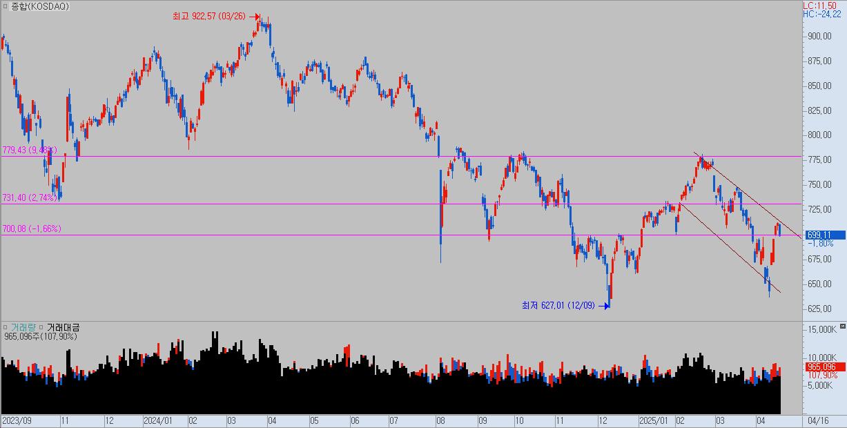 특히 오늘 코스닥 지수를 보면, 우하향 추세의 상단부에 위치해 있었고, 지지를 받을 수도 있는 애매한 자리처럼 보였습니다.