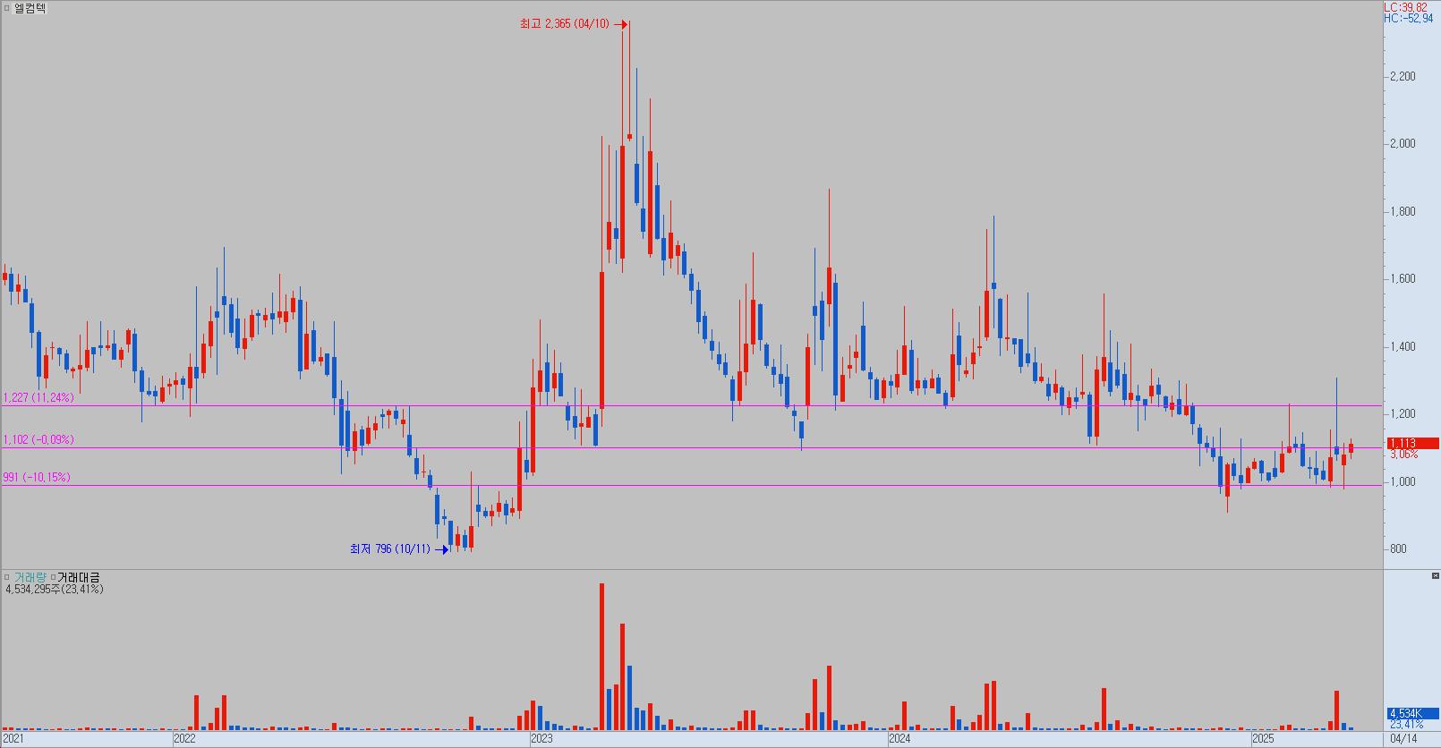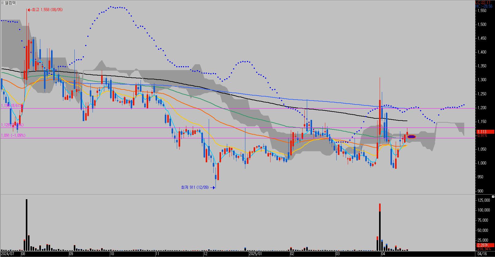 엘컴텍은 원래 휴대폰용 카메라 렌즈 및 LED 조명을 제조·판매하는 전자부품 기업이지만, 최근 주가 상승의 핵심은 바로 금 테마 편입입니다. 이 회사는 몽골에 위치한 3개의 금 광구 탐사권을 확보하고 있으며, 현재 실제 광산 개발도 진행 중입니다. 이러한 점이 금 가격 상승의 직접적인 수혜 종목으로 시장의 주목을 받고 있습니다. 여기에 4월 15일 기준으로 단기 이동평균선이 장기 이동평균선을 상향 돌파하는 '골든크로스'가 발생해 기술적 분석 측면에서도 매수세가 유입되고 있습니다. 종가는 3.48% 상승 마감하며 관심을 더욱 집중시켰습니다.