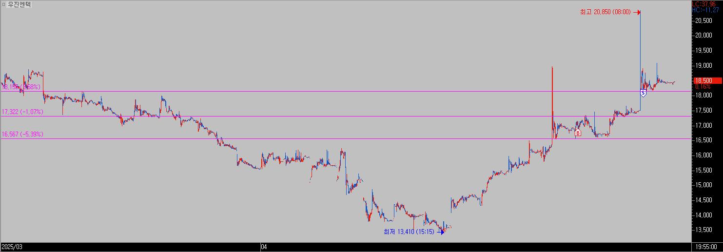 | 우진엔텍 | 2024.04.16. | 16,910 | 2025.04.18. | 17,950 | 3 | +5.98% |