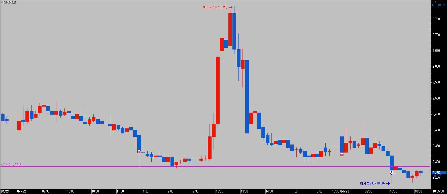 금일 인성정보 종목이 체결되었습니다. 체결 이후 한 차례 급등하는 모습을 확인할 수 있었습니다.