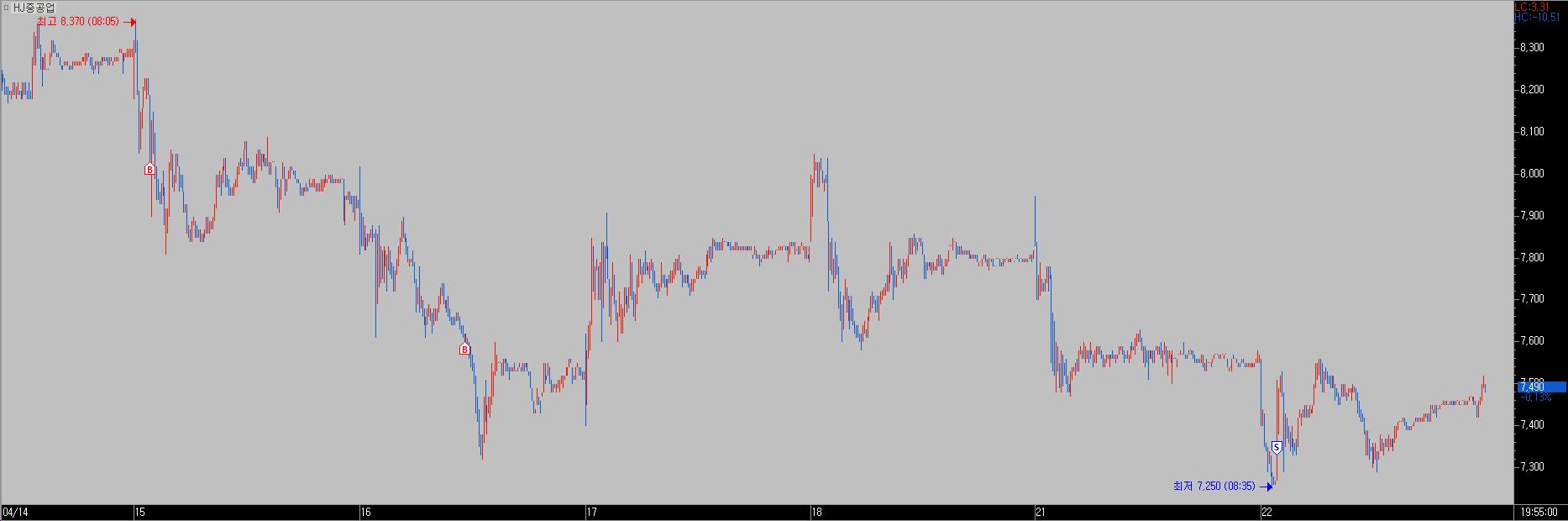 처음에는 '뭐지?' 싶은 매매였습니다. 자동주문에 의해 매도는 체결되었지만, 굳이 손절하지 않아도 되었을 것 같다는 생각이 들었습니다. 선박 관련 재료도 아직 남아 있다고 판단했고, 현재는 박스권 지지선 하단에 위치하고 있어 좀 더 지켜볼 수 있는 구간이었습니다.