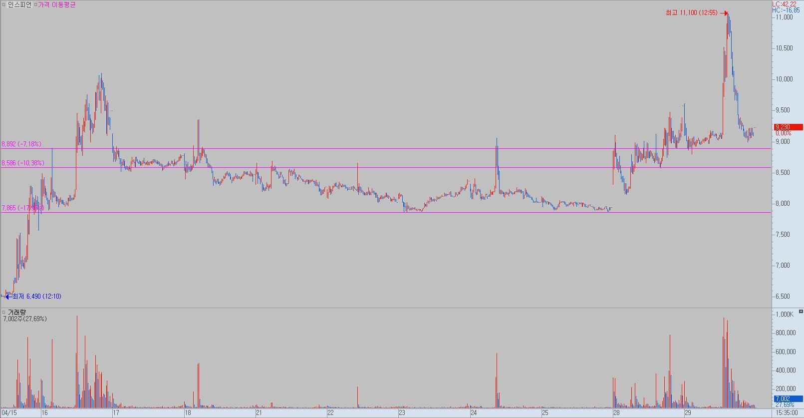 28일 정보보안 테마가 전일 대비 5.26% 상승하는 강세를 보였으며, 인스피언은 이날 전 거래일 대비 14.85% 상승했습니다. 같은 시기 다른 보안 관련 종목들도 상승세를 보였으며, 특히 한싹은 상한가를 기록했습니다. 인스피언 역시 이와 같은 보안주 흐름 속에서 급등세를 이어갔습니다.