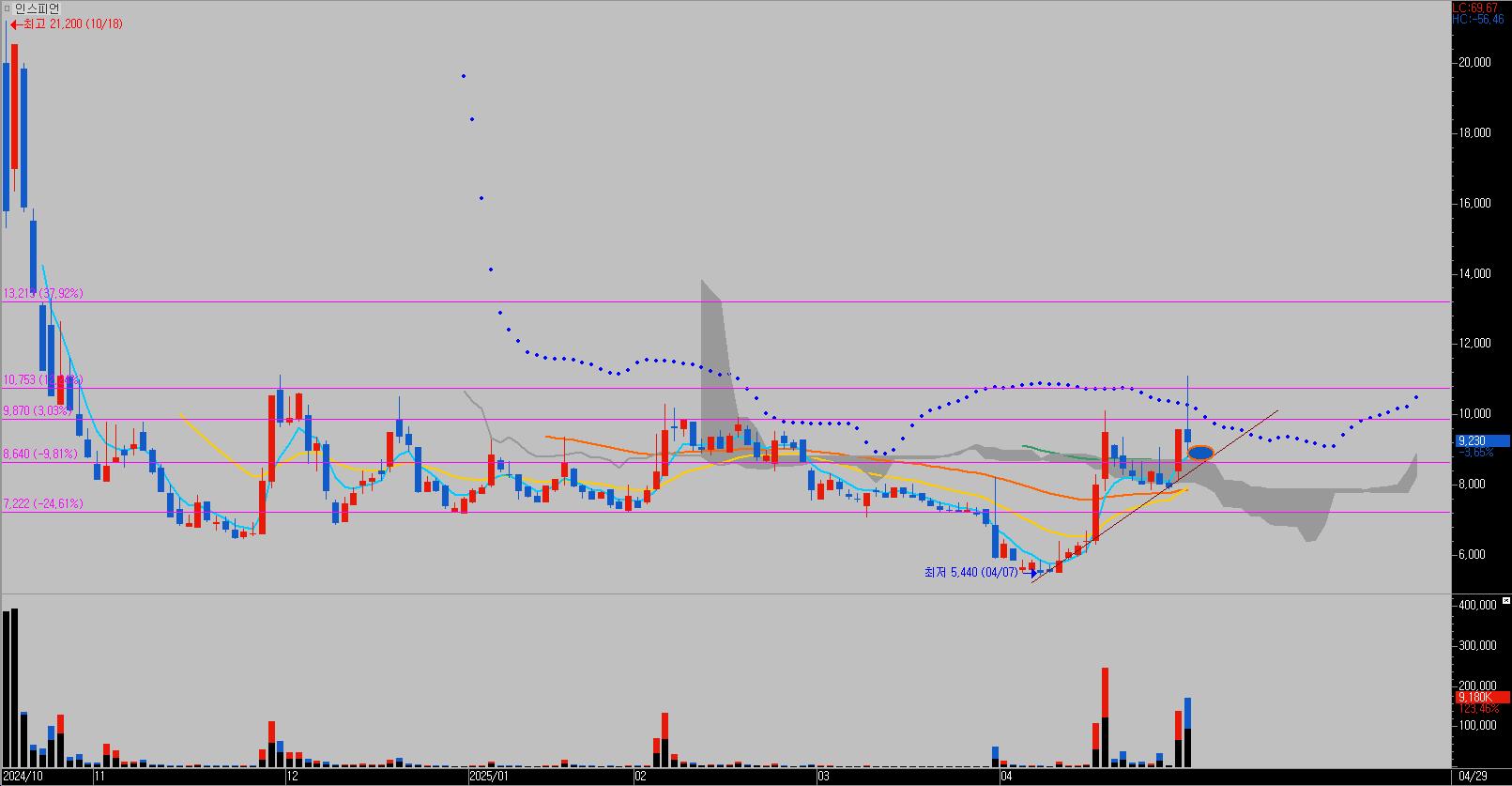 - 일봉과 주봉 차트 모두 바닥 구간에 위치해 있는 것으로 보임