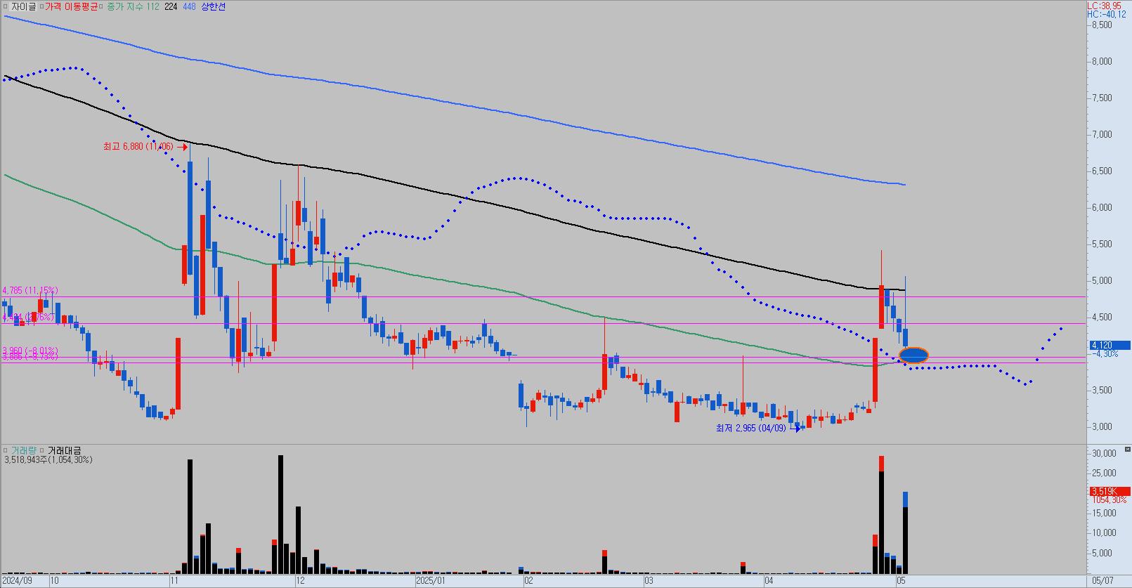 - 강한 거래량 동반 슈팅 확인됨. 오늘 윗꼬리 달고 내려온 모습으로 앞 물량 소화 과정으로 해석 가능함