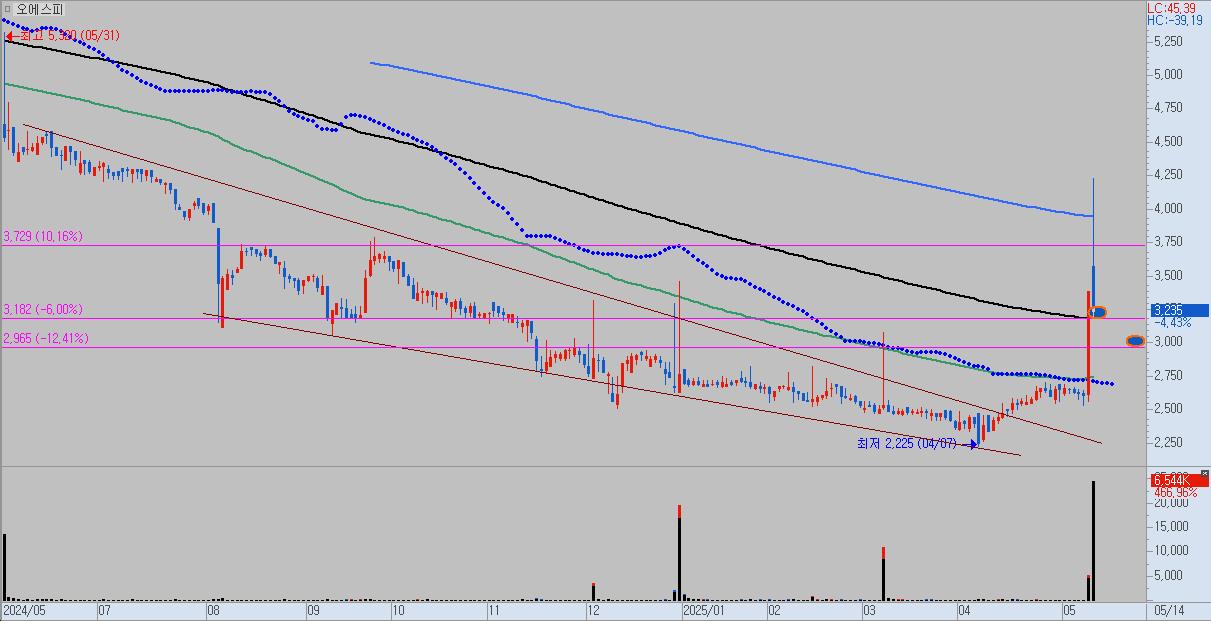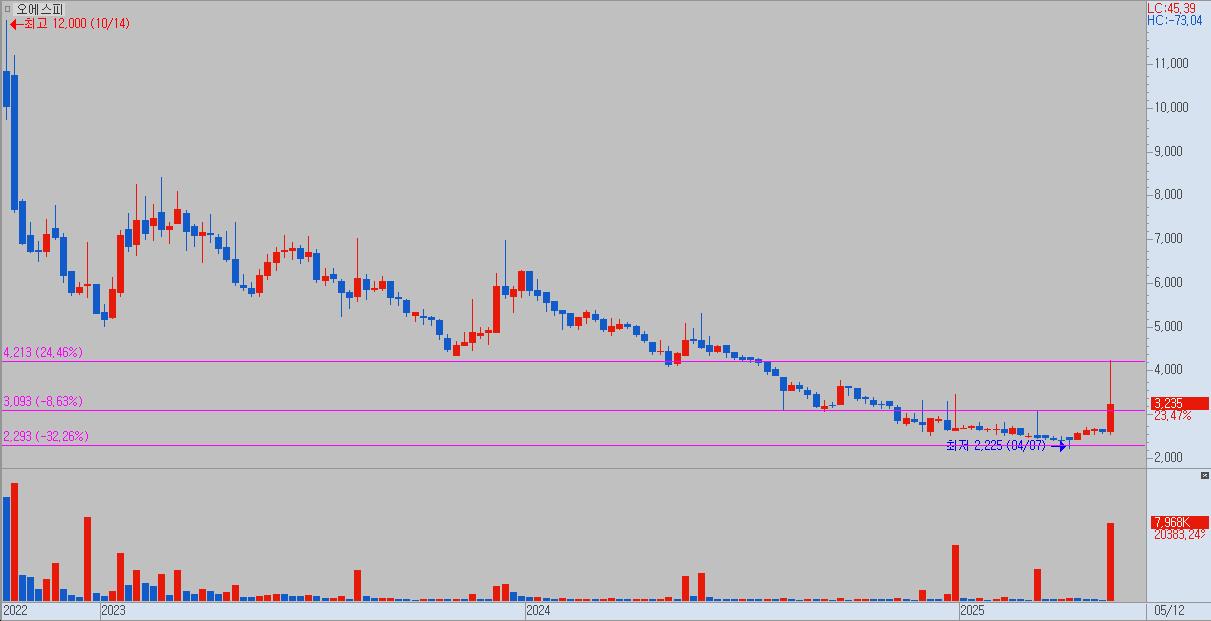 오에스피는 5월 13일 기준 전 거래일 대비 29.94% 상승한 3,385원에 마감했으며, 5월 14일 장 초반에도 24.52% 상승한 4,215원에 거래되고 있습니다.