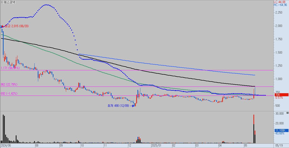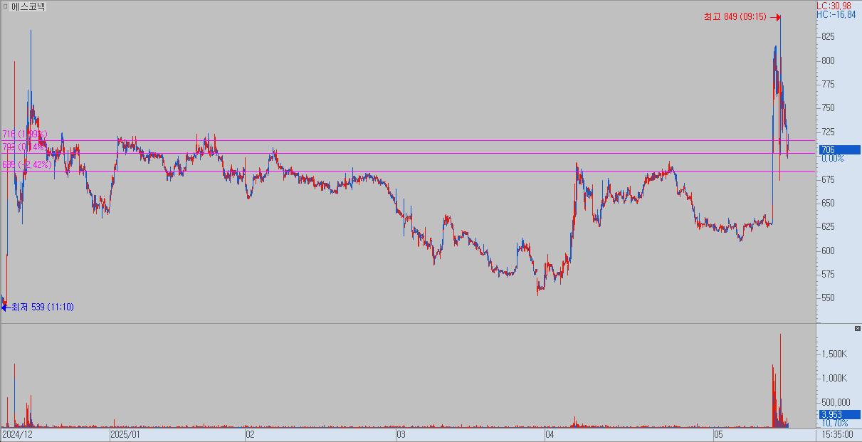 에스코넥은 스마트폰 금속 부품 제조를 주력으로 성장해 온 기업으로, 최근 주가가 급등했습니다. 2025년 5월 16일 오전 10시1분 기준 주가는 24.84% 상승한 784원에 거래되었습니다. 주가는 이중 바닥에서 벗어나며 장대양봉 흐름을 보였습니다.