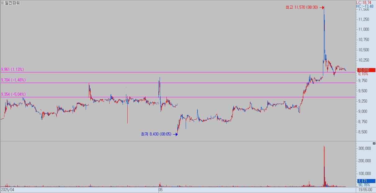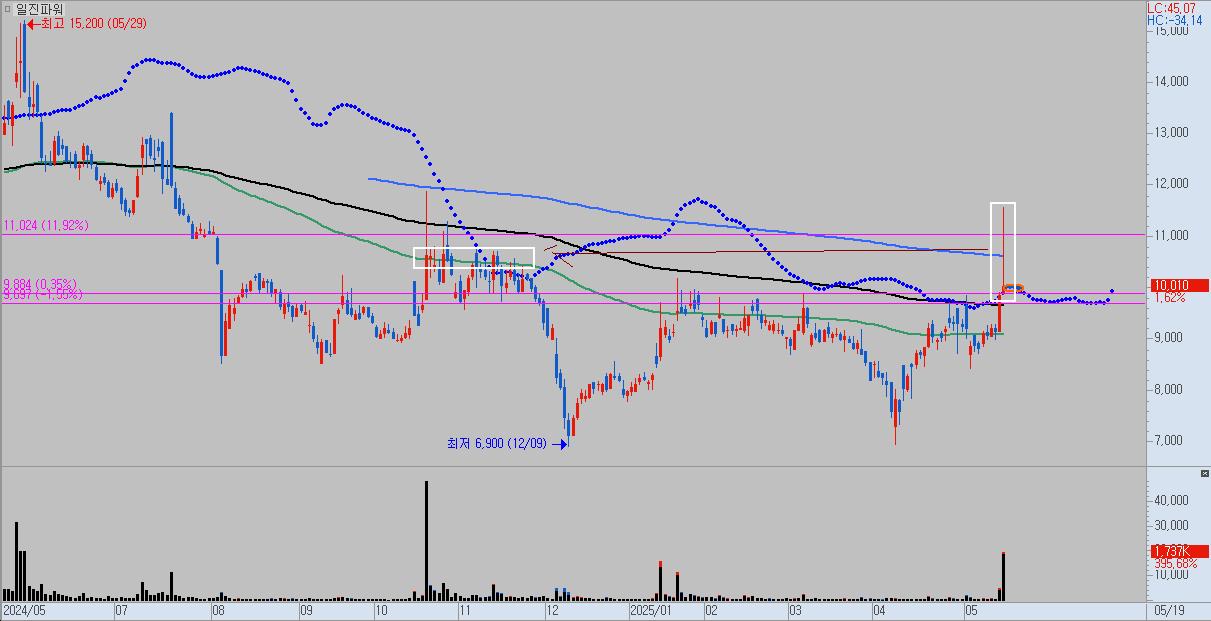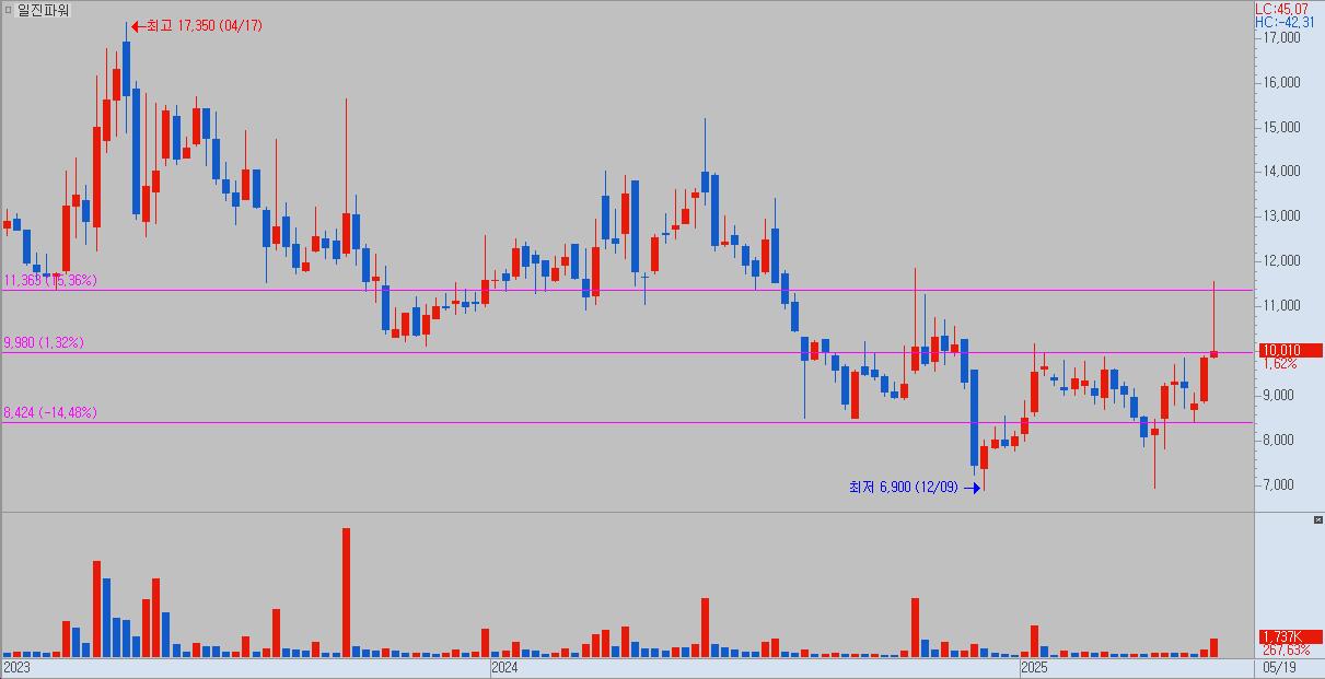 일진파워는 설비 및 산업 플랜트 정비·제조 분야에서 꾸준한 성장을 이어온 기업으로, 최근 주가가 상승세를 보이고 있습니다. 2025년 5월 19일 오전 9시 2분 기준 주가는 10.59% 상승한 1만 860원에 거래되고 있으며, 장기 박스권에서 벗어나려는 흐름을 보이고 있습니다.