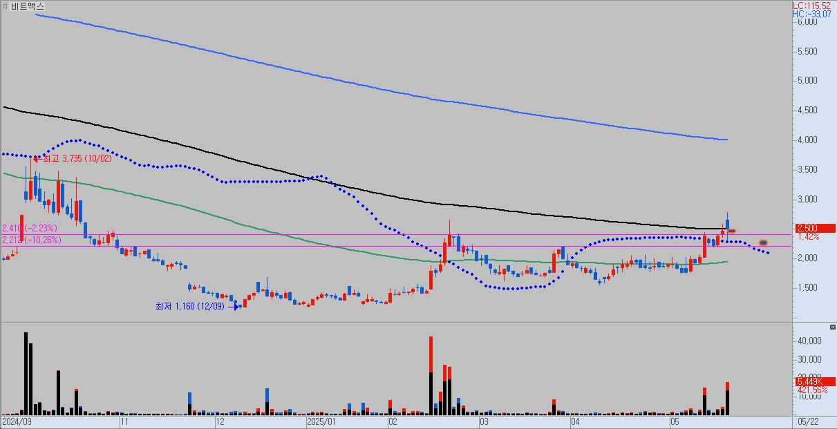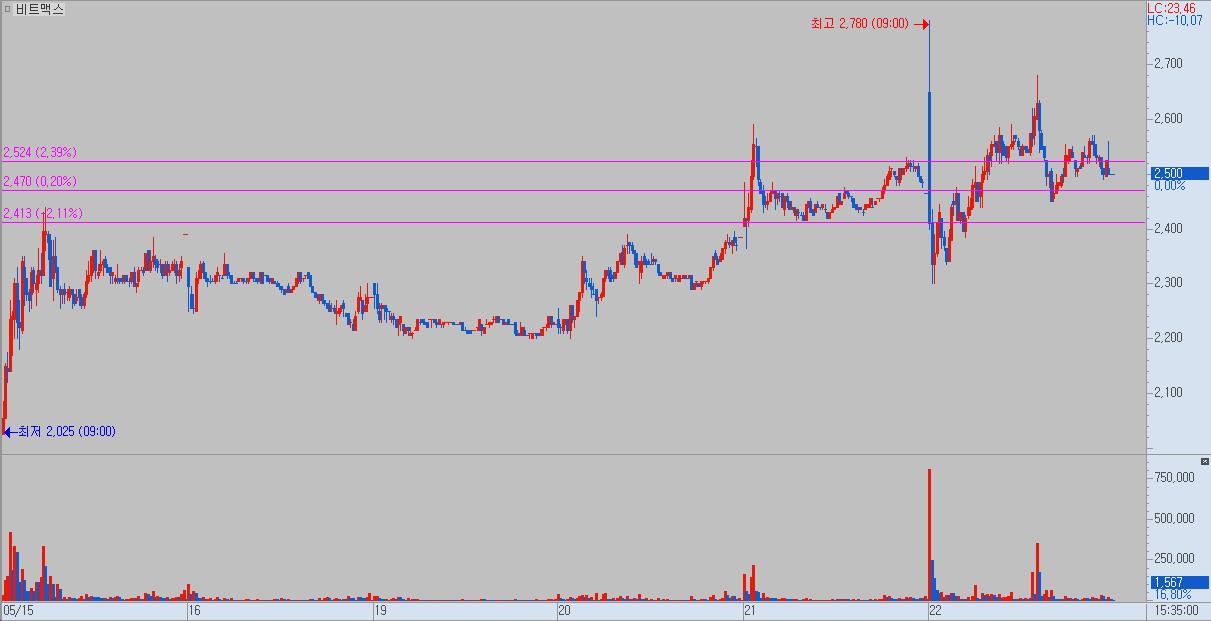 비트맥스 주가가 강세를 보이고 있다.20일 한국거래소에 따르면 이날 6.52% 올라 2370원에 거래되고 있다.주가는 장기 박스권에서 벗어나 가속도를 내고 있다.비트코인을 핵심 자산으로 삼는 신사