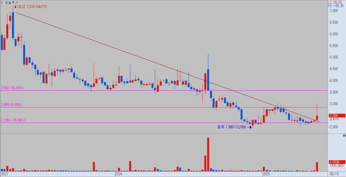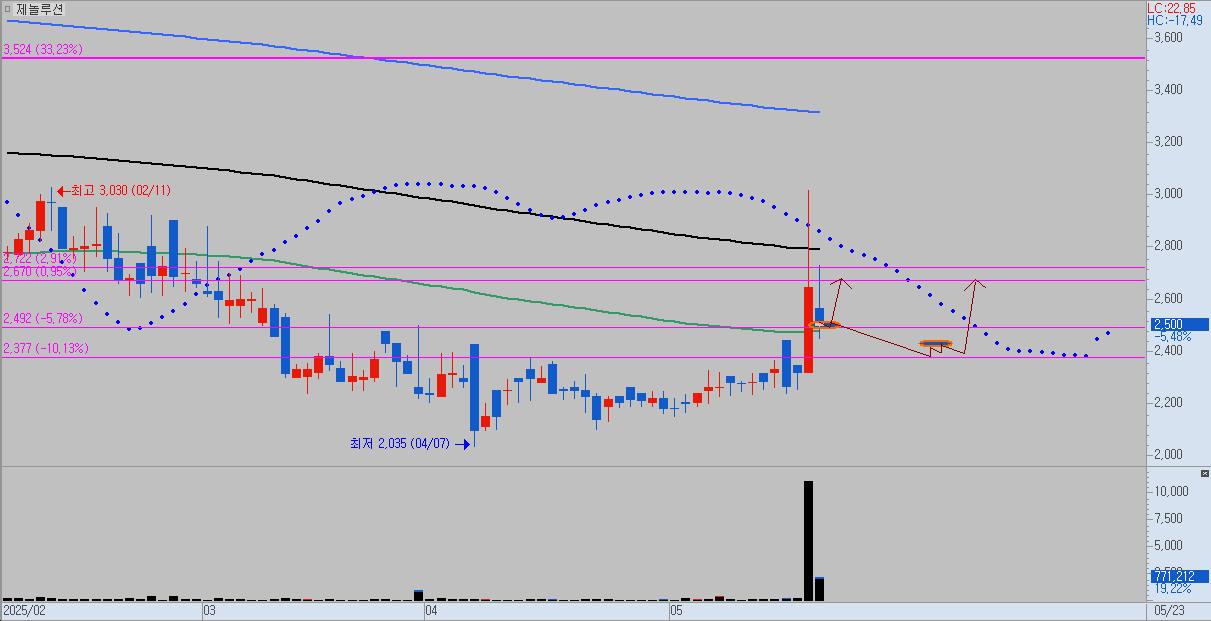 - 해당 차트 역시 제놀루션과 유사하게, 상승 캔들의 중심 가격대가 장기이평선 지지와 매물대 지지 구간에 위치해 있어 의미 있는 자릿값임