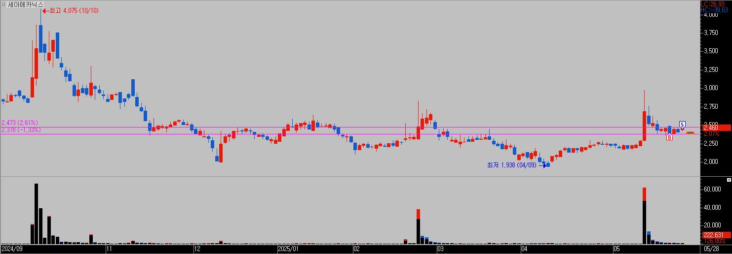 | 세아메카닉스 | 25.05.23. | 2,398 | 25.05.28. | 2,445 | 4 | +1.79% |
