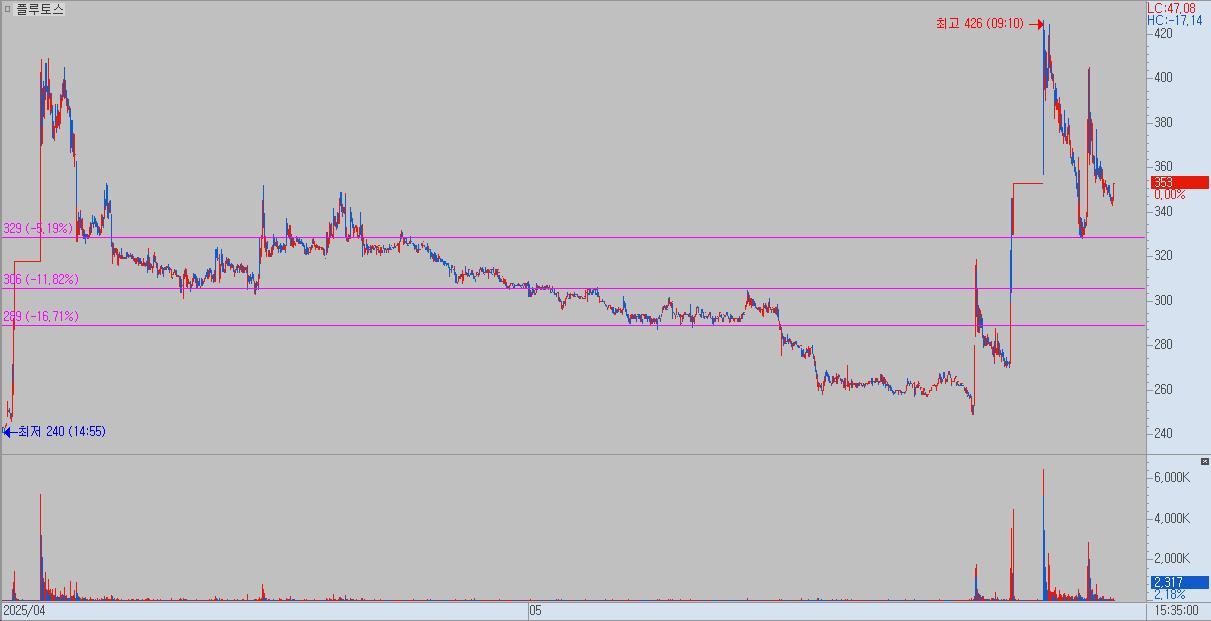 플루토스는 5월 27일, 전일 대비 29.78% 오른 353원으로 상한가를 기록했습니다. 주가는 이날 오후 3시 25분 기준 급등하며 시장의 주목을 받았습니다.