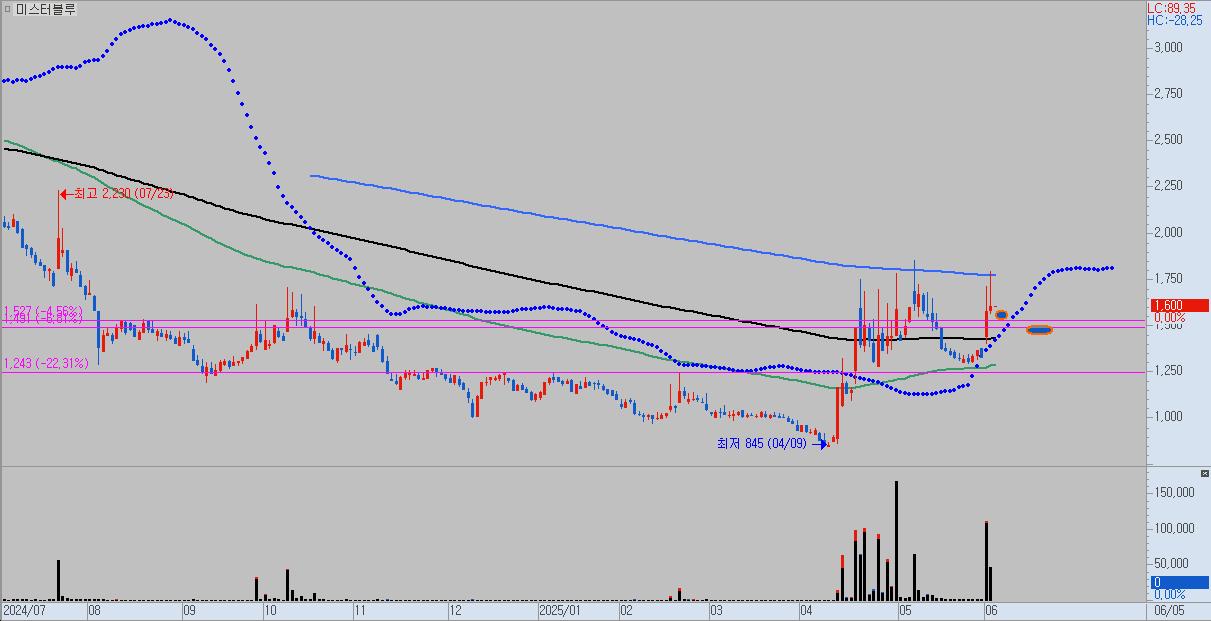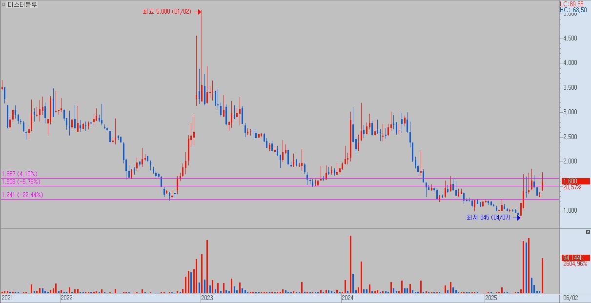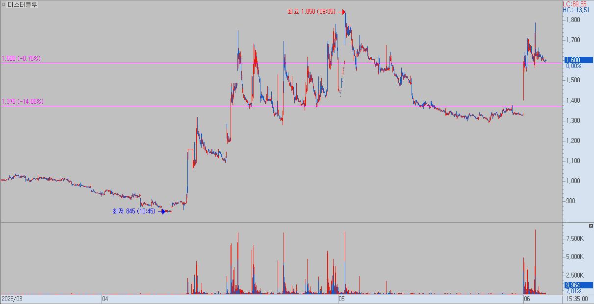 미스터블루는 K웹툰의 넷플릭스 진출 기대감에 힘입어 연일 강세를 보이고 있습니다. 6월 4일 기준, 미스터블루는 전 거래일에 이어 또다시 거래량이 폭증하며 장중 최고가 기준 13%를 넘는 상승세를 기록했습니다. 지난 5월 31일에는 거래량이 무려 6,657만 주를 기록하며 장중 상한가를 터치했고, 6월 2일에도 6,609만 주가 넘는 거래량으로 코스닥 실시간 거래량 1위를 차지했습니다. 같은 날 주가는 1,577원으로 마감했으며, 상승률은 18.84%에 달했습니다. 거래대금은 1,067억 원으로 시가총액의 8.15%를 차지하며, 강한 매수세가 집중된 모습을 보여주었습니다. 최근 주가 흐름은 네이버웹툰의 넷플릭스 탑재설에 대한 기대가 반영된 결과로 해석되고 있습니다.