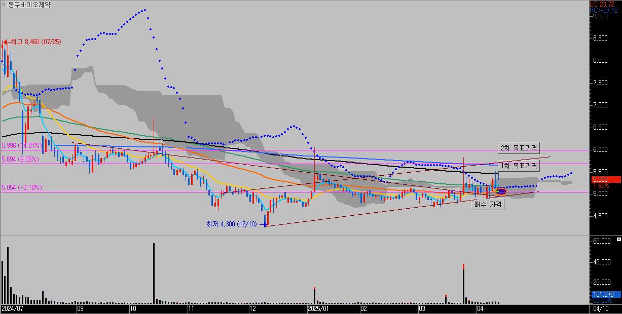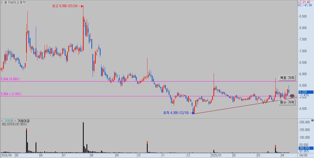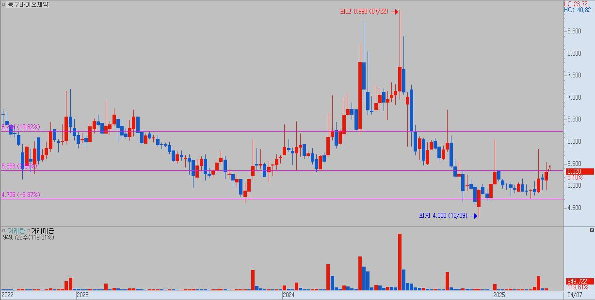 - 저점을 높이며 우상향 흐름을 이어가던 동구바이오제약은 최근 급등 이후 조정을 받으며 5,200원 부근에서 지지를 받는 흐름을 보이고 있음