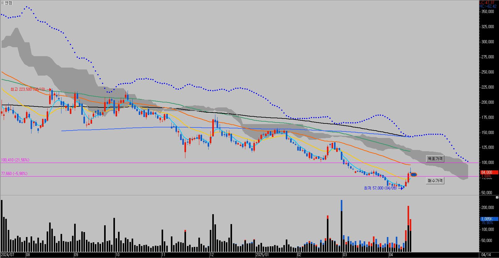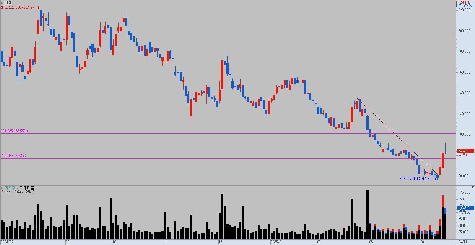 엔켐의 주가는 최근 기술 협력 발표와 미국 관세 이슈에 대한 반사이익 기대감으로 강세를 보였습니다. 4월 11일 종가 기준 83,200원이던 주가는 14일 장중 91,500원을 기록하며 약 10% 상승했습니다. 이번 주가 흐름은 전고체 배터리 기술 상용화에 대한 기대감과 비중국계 소재 수요 확대 가능성이 동시에 반영된 결과로 풀이됩니다.